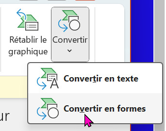 sous l'onglet Création de graphique SmartArt, groupe Rétablir, cliquez sur le bouton Convertir puis sur Convertir en formes.