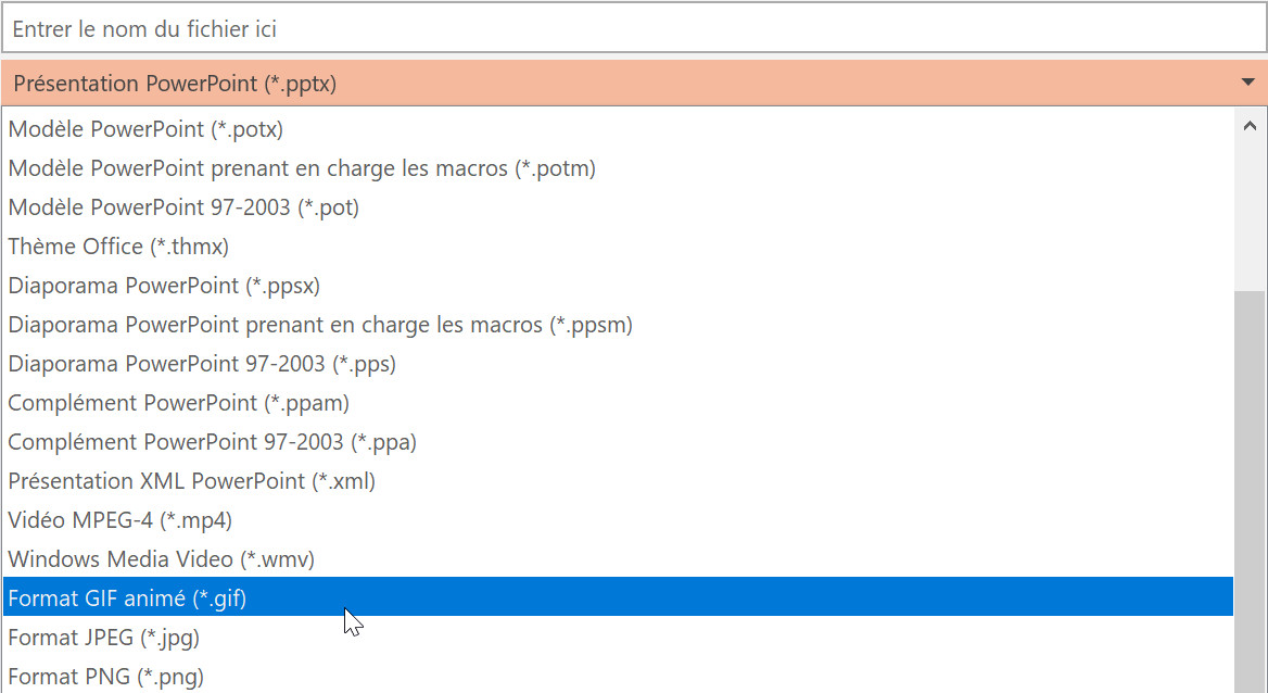 C'est très simple ! Après avoir créé votre présentation PowerPoint, il suffit de l'enregistrer en choisissant le format GIF ANIME.