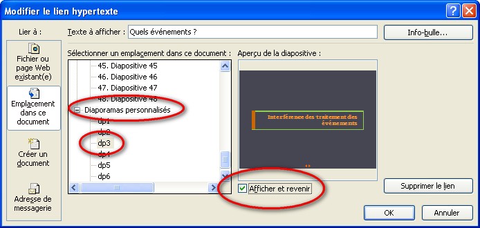 Ensuite il faut créer un lien hypertexte sur chaque item du sommaire vers l'un de ces diaporamas personnalisés et cocher l'option "Afficher et revenir".