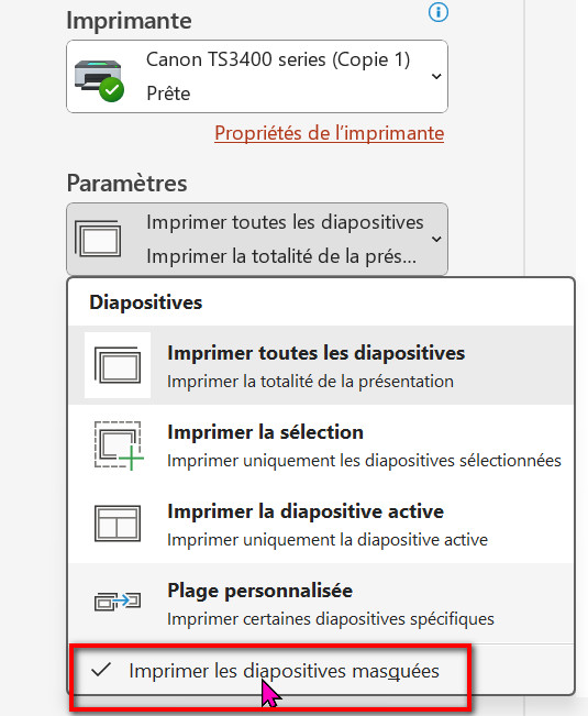 Ensuite, dans la boîte de dialogue d'impression il faut décocher l'option Imprimer les diapositives masquées.