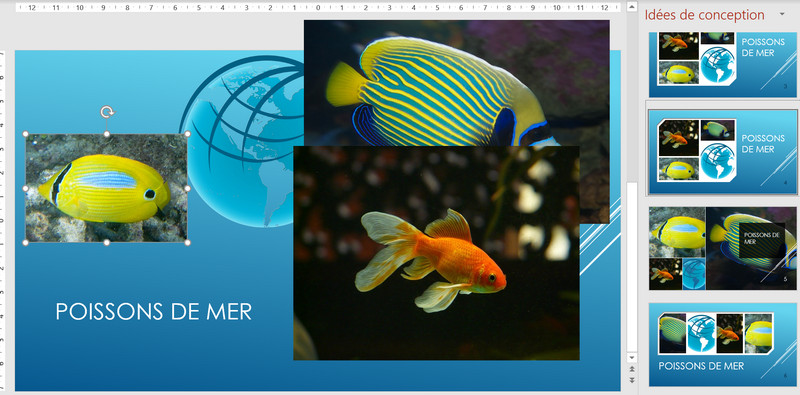 Le Concepteur PowerPoint vous permet de formater automatiquement vos diapositives en aménageant les objets (images, textes, etc.). Le concepteur ouvre un volet à droite de la fenêtre PowerPoint et vous fait plusieurs propositions. Il suffira de cliquer dessus pour appliquer cette mise en page à la dispositive en cours. Si le volet ne s'affiche pas automatiquement, vous pouvez également cliquer sur le bouton Idées de conception situé sous l'onglet Conception.