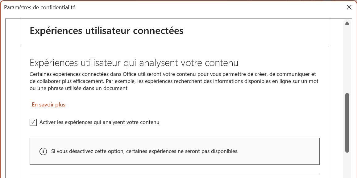 - Dans la fenêtre Paramètres de confidentialité, rubrique Expériences utilisateur connectées, cochez l'option Activer les expériences qui analysent votre contenu.