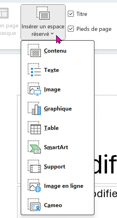 Onglet Masque des diapositives, groupe Mise en page du masque, Bouton Insérer un espace réservé => choisir le type d'espace réservé.