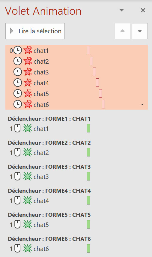 • Toujours dans le volet Animation, sélectionnez toutes les animations de sortie (de couleur rouge) (conservez la touche Ctrl enfoncée pour la multisélection).