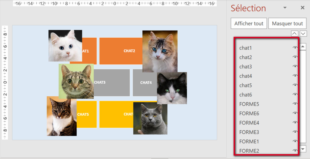 Pour simplifier l'opération, je vous conseille de nommer et de numéroter chaque élément de 1 à n ainsi que chaque image. Ainsi l'image Image1 s'affichera lors d'un clic sur la forme Forme1, l'image Image2 s'affichera lors d'un clic sur la forme Forme2, etc. Pour renommer vos objets, affichez le volet Sélection.