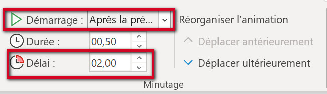 • Dans le groupe Minutage, choisissez à présent Après la précédente dans la liste déroulante Démarrage.