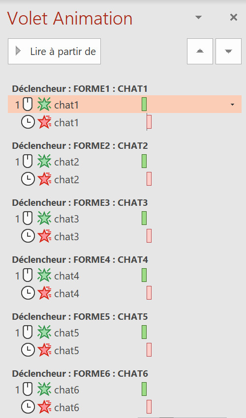 Arrivé à ce stade, chaque image est dotée de deux animations : une animation d'apparition qui ne se déclenchera que lors d'un clic sur une forme, et une animation de disparition (numérotée 1) qui ne pourra se déclencher que, bien évidemment, lorsque l'image aura d'abord été affichée. Il va donc falloir modifier l'ordre de ces deuxièmes animations afin que chaque animation de sortie suive l'animation d'entrée.