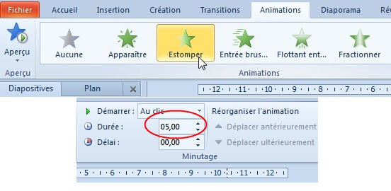 - Dans le groupe Minutage, choisissez un durée d'environ 5 secondes.