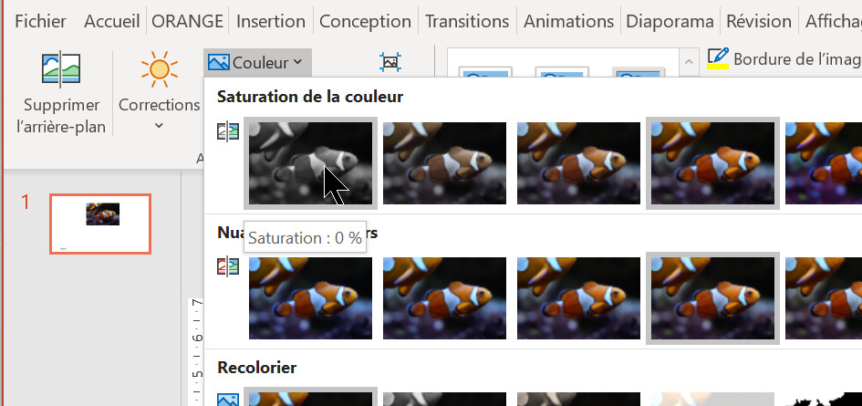 Sous l'onglet Format de l'image, groupe Ajuster, cliquez sur la flèche déroulante du bouton Couleur, et choisissez la saturation à 0% sous la rubrique Saturation de la couleur.