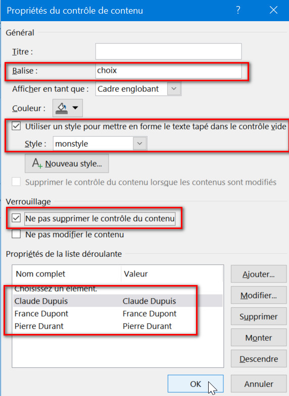 Pour commencer, insérez un Contrôle de contenu de liste déroulante (onglet Développeur, groupe Contrôles), puis cliquez sur Propriétés. Dans la boîte de dialogue Propriétés du contrôle de contenu :