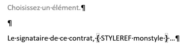- Appuyez sur Ctrl+F9 et entre les { } tapez le nom du champ suivi du nom du style (monstyle dans mon exemple). Vous devez obtenir ceci : { STYLEREF monstyle }.