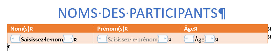 Préparez le modèle pour un seul participant, avec par exemple trois contrôles de contenu, l'un pour le nom, le deuxième pour le prénom et enfin le troisième pour l'âge. L'exemple ci-dessous utilise un tableau. C'est plus pratique, mais pas indispensable.