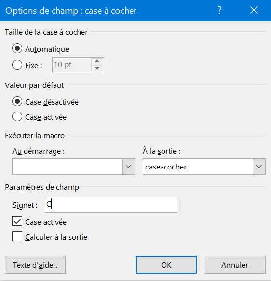 - Double cliquez sur la case et complétez la zone de texte Signet.