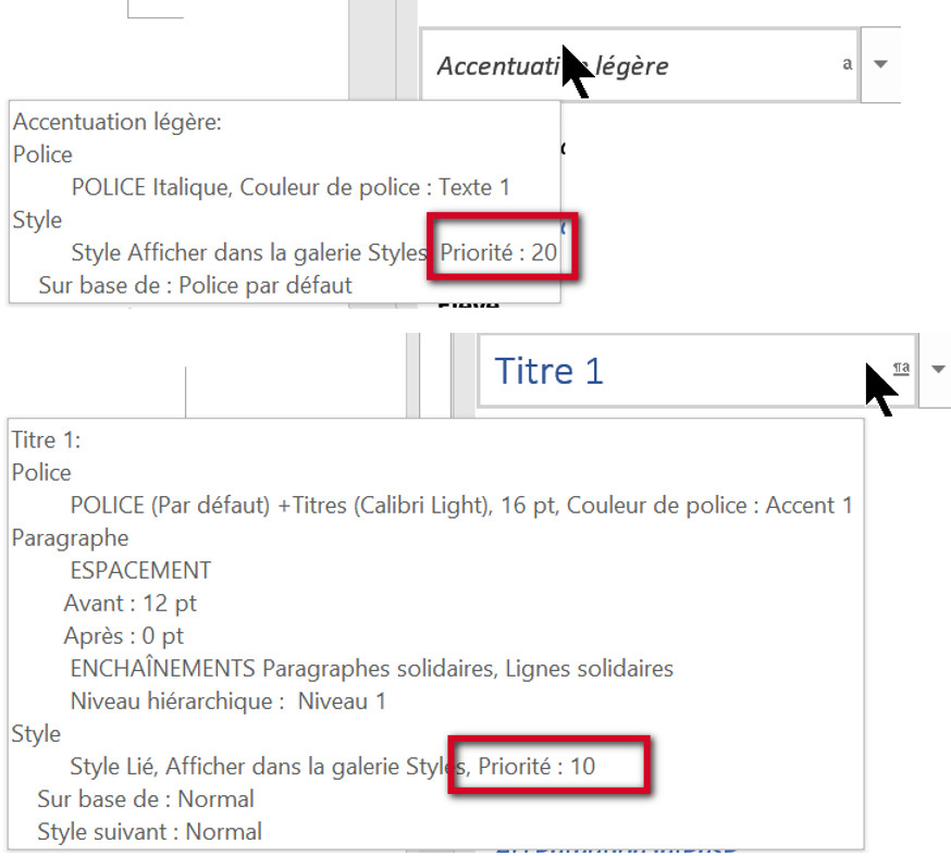 Lorsque vous pointez sur un style, dans le volet des styles, vous obtenez un certain nombre d'informations sur le style en question, et, parmi ces informations, vous voyez le terme Priorité suivi d'un numéro.