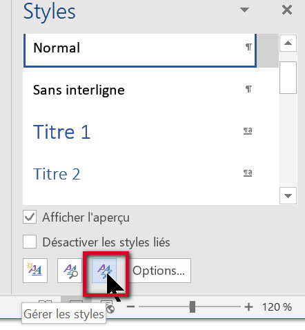 Tout cela est réglé par défaut dans Word. Mais, bien entendu, vous avez la possibilité de gérer vos styles comme vous l'entendez. Et pour modifier les numéros de priorité, vous devez afficher la boîte de dialogue Gérer les styles, en cliquant sur le bouton du même nom, tout en bas du volet Styles (3e bouton).