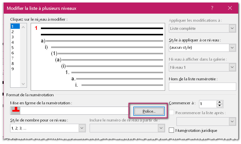 Il faut juste personnaliser sa numérotation hiérarchique en cliquant sur le bouton Police. Voir l'article à propos des listes hiérarchiques.