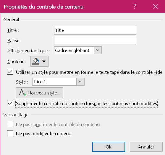 - Cliquez sur Propriétés et choisissez le style Titre 1 pour le style à utiliser, et cochez l'option Supprimer le contrôle du contenu lorsque les contenus sont modifiés.