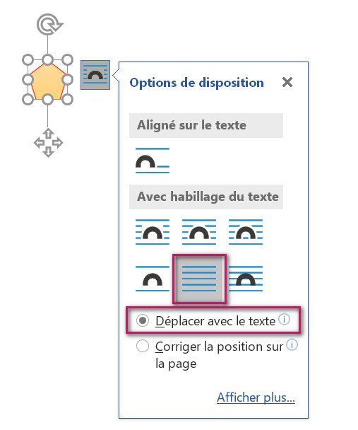 - Après avoir entré un titre, utilisez la boîte de dialogue Forme pour insérer l'objet qui vous convient, et appliquez la mise en forme qui vous plait du point de vue remplissage, contour, etc. Cette forme devra avoir un "habillage en-dessous". Donc sélectionnez la forme, cliquez sur le bouton des options de mise en page, cochez Derrière le texte, et impérativement cochez Déplacer avec le texte.