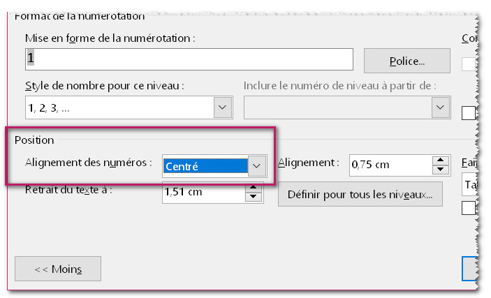 Important : Lors de la création de votre liste hiérarchique, il faudra impérativement choisir un alignement centré, si vous ne voulez pas voir le numéro 10 qui déborde de la forme !