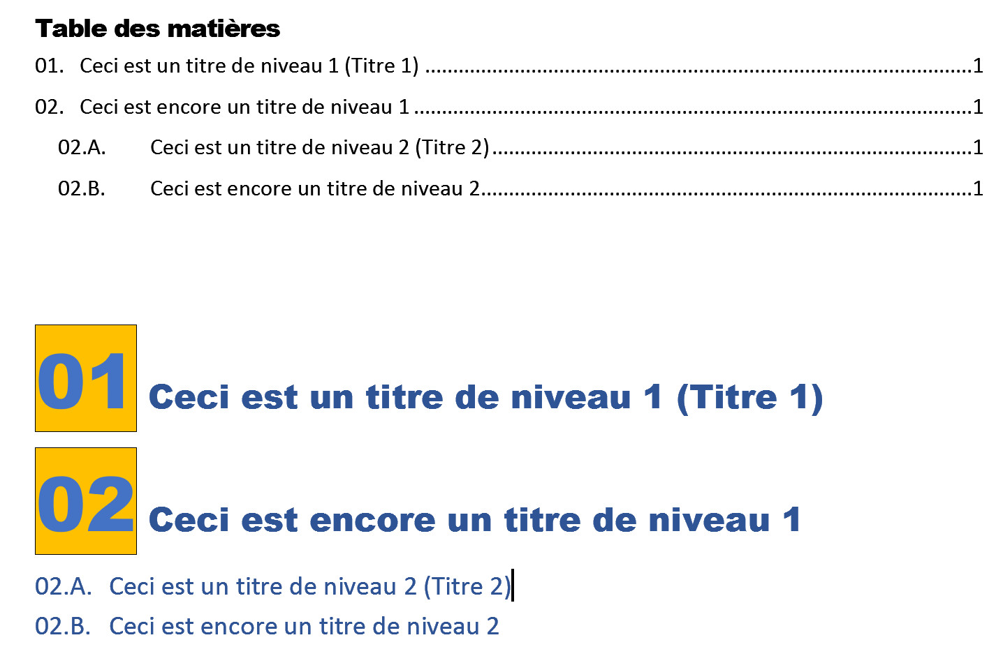 Dans les tous les exemples ci-dessus, la table des matières ne va pas poser de problème. Elle va reprendre la numérotation choisie. Si vous avez opté pour une autre police, une autre couleur, une autre taille, etc., seule la police différente sera respectée dans le sommaire. Si vous avez choisi d'insérer la numérotation sur une ligne seule, la table des matières ne tiendra pas compte de ces sauts de ligne, comme vous pouvez le voir ci-dessous.