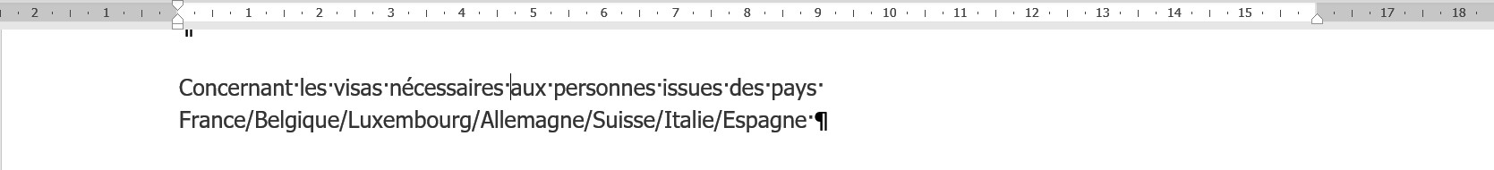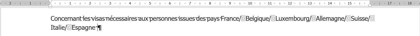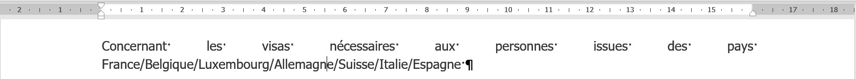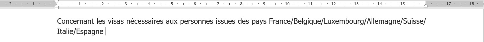 Voici un exemple pour le texte suivant :  "Concernant les visas nécessaires aux personnes issues des pays France/Belgique/Luxembourg/Allemagne/Suisse/Italie/Espagne"