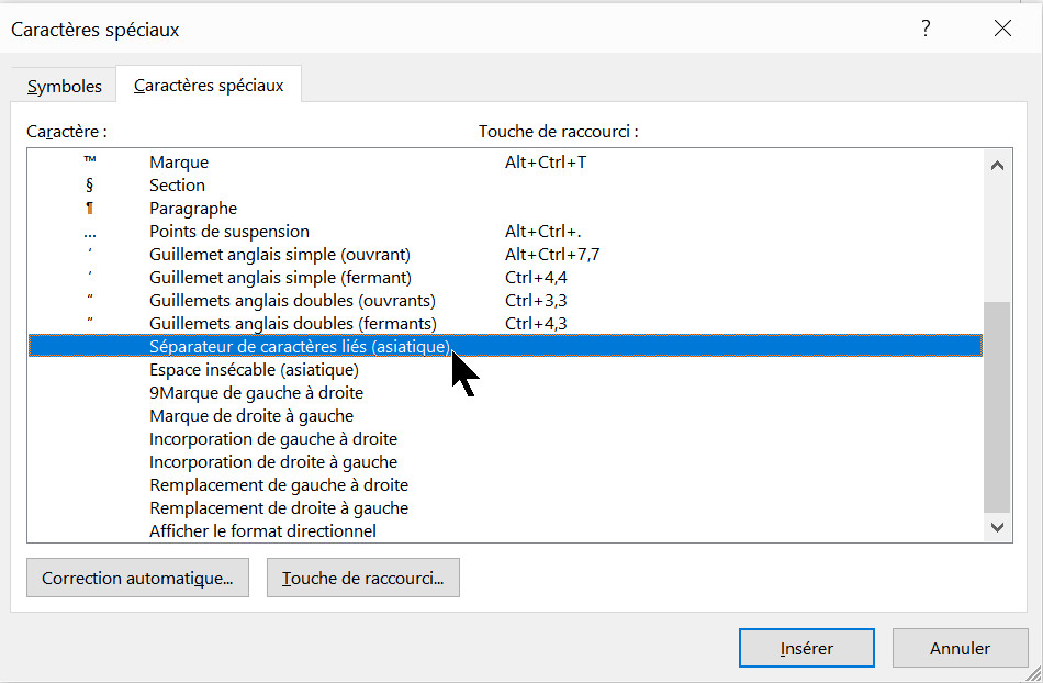 • Sélectionnez le caractère Séparateur de caractères liés (asiatique) et cliquez sur Insérer.
