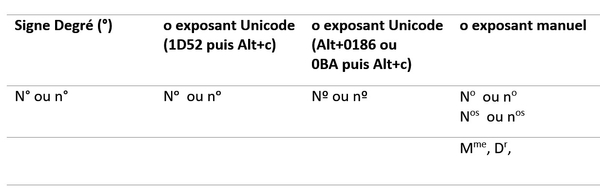 La plupart des utilisateurs choisissent le symbole du degré (°) pour abréger le mot numéro…