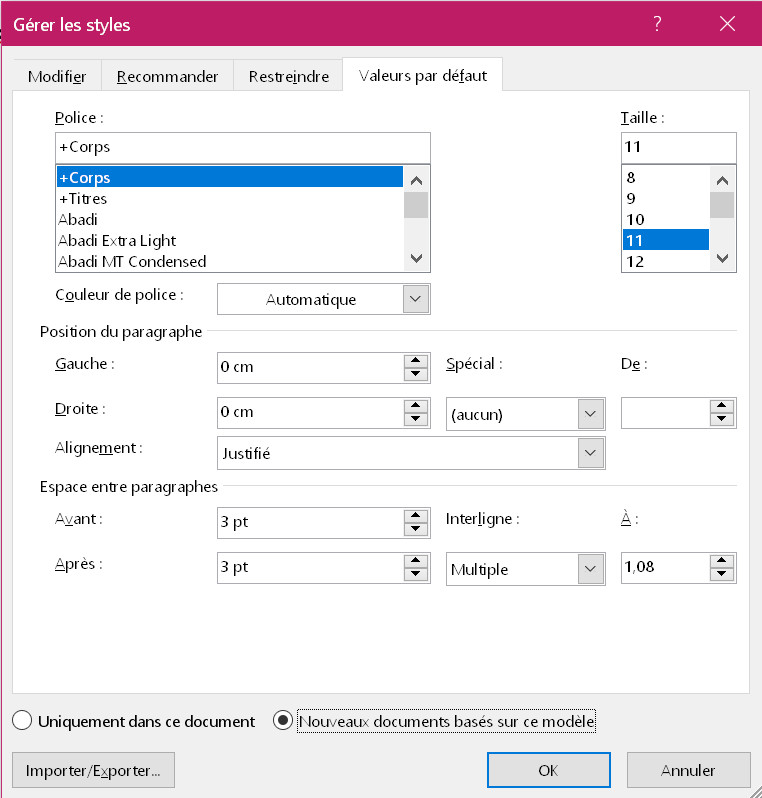Vous pouvez constater, en revanche, que tout le reste peut être choisi par défaut : la taille de la police, la couleur (dans le jeu de couleurs), les espacements, retraits, etc.