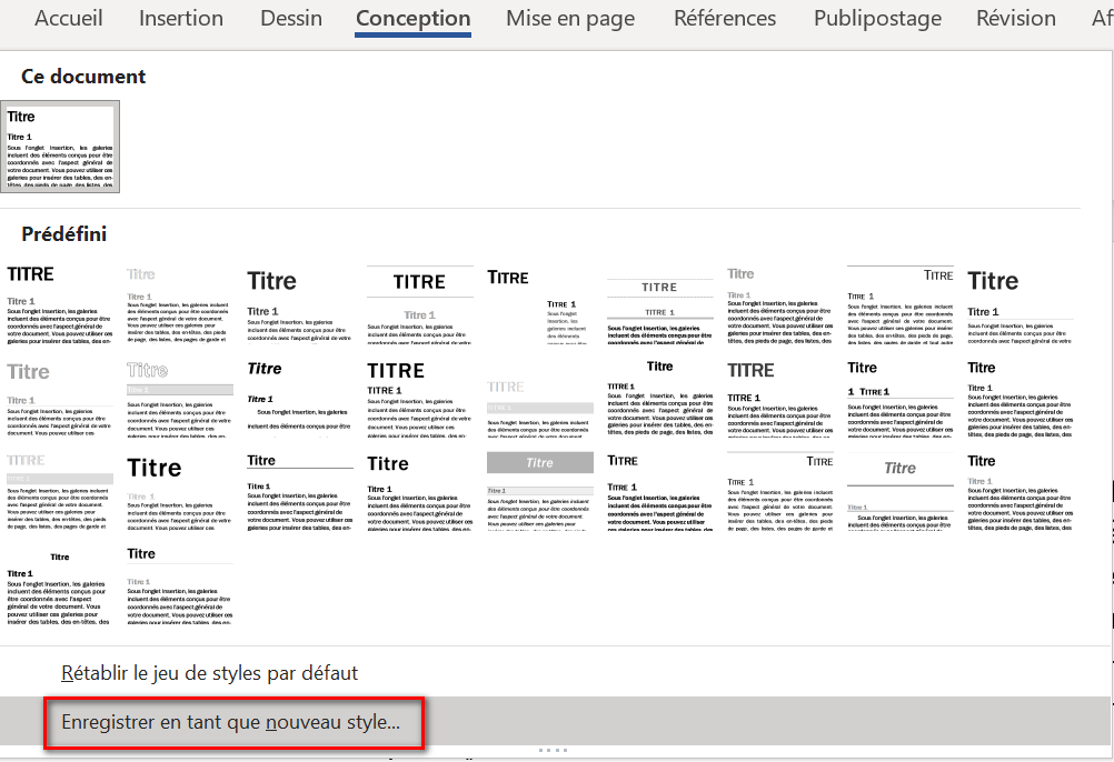 Une fois ces modifications faites, enregistrez à nouveau ces styles en tant que jeu de styles indépendant : Sous l'onglet Conception, cliquez à nouveau sur la liste déroulante des jeux de styles et choisissez Enregistrer en tant que nouveau style...