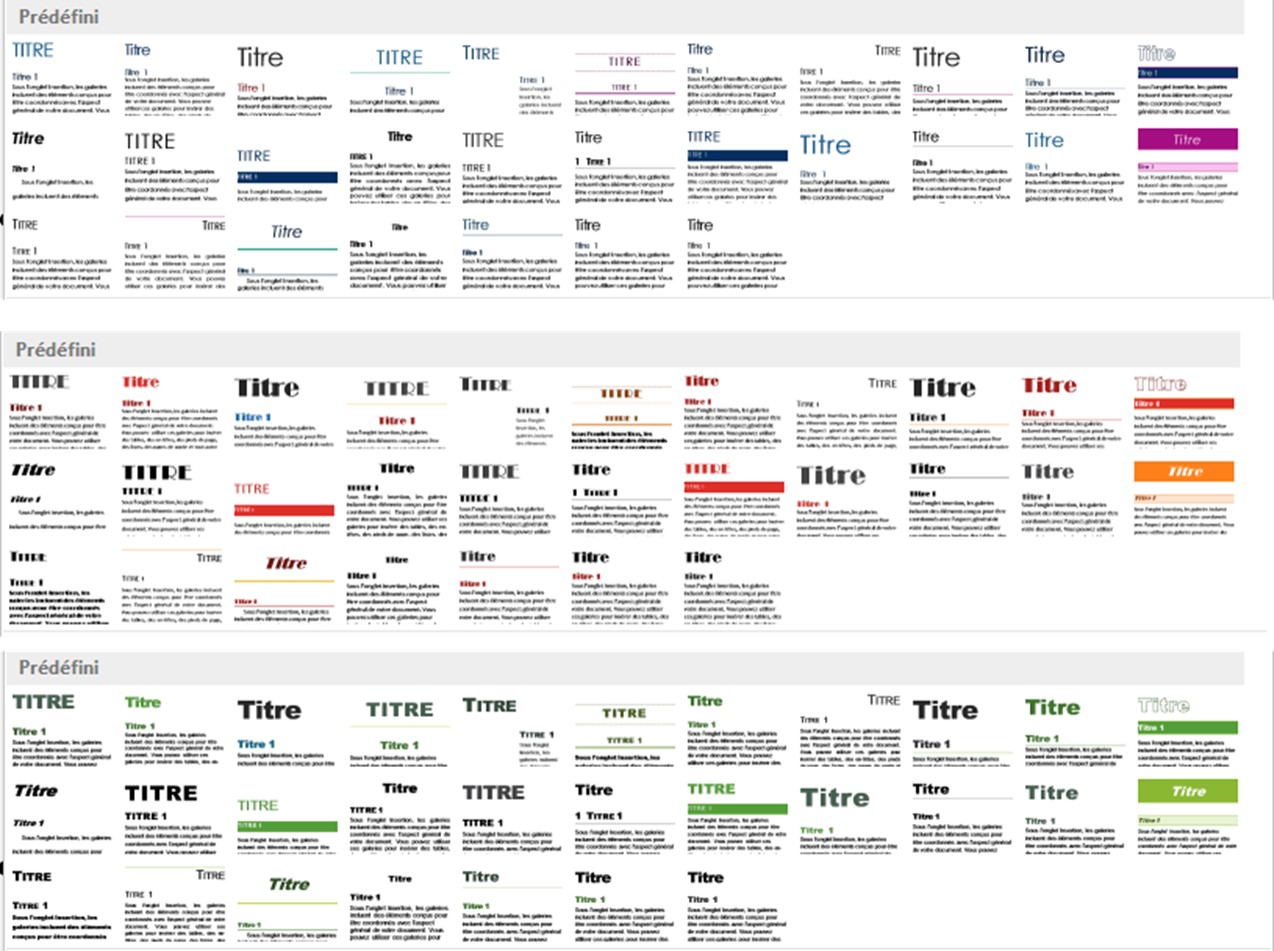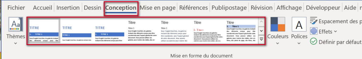 Un jeu de styles est un ensemble de styles prévus pour fonctionner ensemble. Les jeux de styles sont des fichiers indépendants qui peuvent être utilisés avec n’importe quel document. Ils permettent d’obtenir un document toujours homogène et harmonieux avec un minimum de manipulations. Vous accédez à la galerie des jeux de styles également via l’onglet Conception.