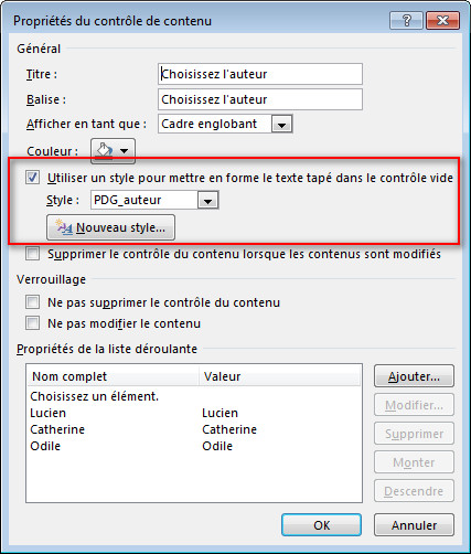Notez la différence entre le contenu de zone de liste déroulante et le contenu de liste déroulante : le premier est modifiable, c'est-à-dire que l'utilisateur pourra saisir autre chose que ce qui est proposé dans la liste. Si cette fonction est inutile, choisissez une zone de liste déroulante car la première pose un petit problème. En effet, le style ne sera pas reconnu dans le champ REFSTYLE, même si ce dernier n'affiche aucune erreur. Il vous faudra réaffecter le style au contrôle une fois qu'il sera inséré et après l'avoir sélectionné.