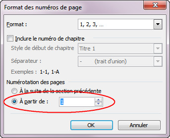 - Sous l'onglet Outils En-têtes et pieds de page/Création, groupe En-tête et pied de page, cliquez sur le bouton Numéro de page, puis sur la commande Format des numéros de page, et choisissez l'option A partir de 1 sous la rubrique Numérotation des pages.