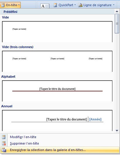 Ces champs peuvent aussi être rentrés manuellement : les { } s'obtiennent par les touches Ctrl + F9. - Sélectionnez tout l'en-tête ou tout le pied de page, puis cliquez à nouveau sur le bouton En-tête (ou Pied de page) et choisissez cette fois l'option Enregistrer la sélection dans la galerie d'en-têtes (ou pieds de page).