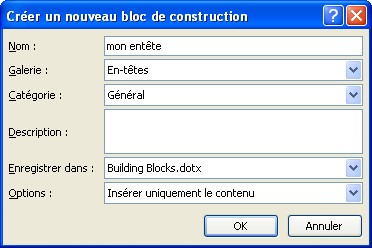 - Dans la boîte de dialogue Créer un nouveau bloc de construction, mettre un nom pour son nouvel en-tête (ou pied de page), créer éventuellement une catégorie si vous avez l'intention de créer toute une série d'en-têtes ou de pdp qui serait divisée en sous catégories, mettez une description et cliquez sur OK.