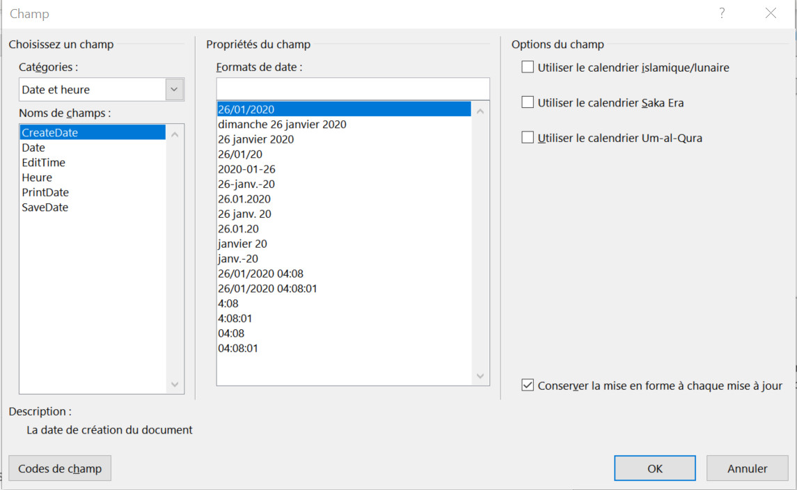 Si l'on coche l'option Mise à jour automatique, on insère un champ et la date se mettra à la date du jour automatiquement à l'ouverture du fichier ou lors de la mise à jour des champs.