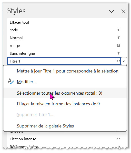 Dans le volet Styles, un clic droit sur le style permet de sélectionner toutes les occurences d'un style