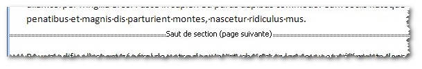Lorsque les marques de format sont affichées, on peut visualiser le saut de section qui se présente sous la forme d'une double bordure en pointillés, et on peut le supprimer comme n'importe quel caractère.