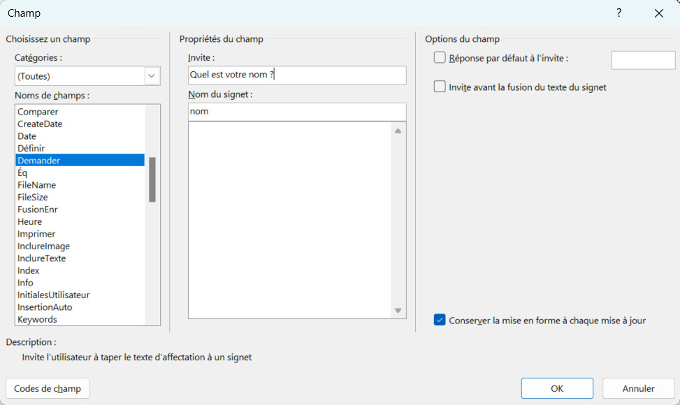 ce qui donnera dans la feuille, si on visualise le code : {ASK nom "quelle est le nom ?" * MERGEFORMAT } - Sinon on ne voit rien.