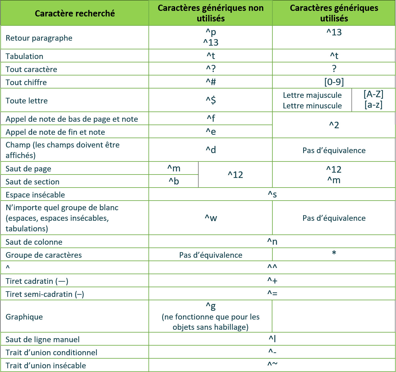 Le tableau suivant liste les caractères spéciaux à utiliser selon si l'option caractères génériques est cochée ou non. Notez que la majorité de ces caractères se trouve dans la liste déroulante Spécial.