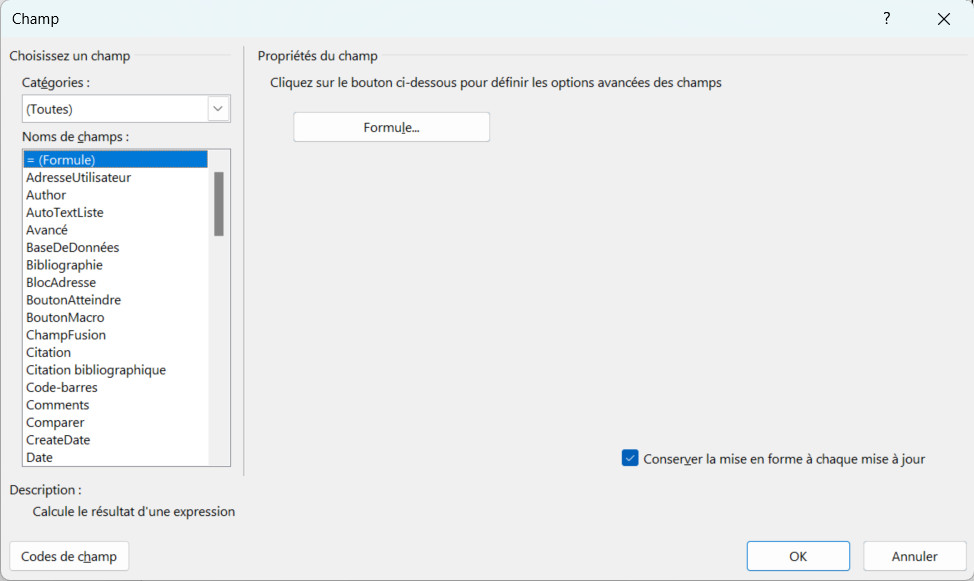 - L'utilisation de cette boîte de dialogue facilite la création de la syntaxe d'un champ et réduit les risques d'erreurs.