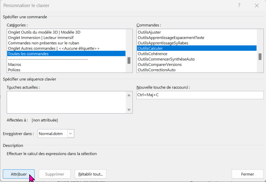 Comment appliquer un raccourci clavier à l'outil Calculer :