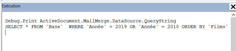 Et enfin, pour vous aider à composer votre code SQL, voici comment procéder : Dans votre document principal de fusion, appliquez le filtre et/ou le tri de votre choix. Puis dans la fenêtre Exécution du VBE, collez le code suivant suivi d'une pression sur la touche Entrée :