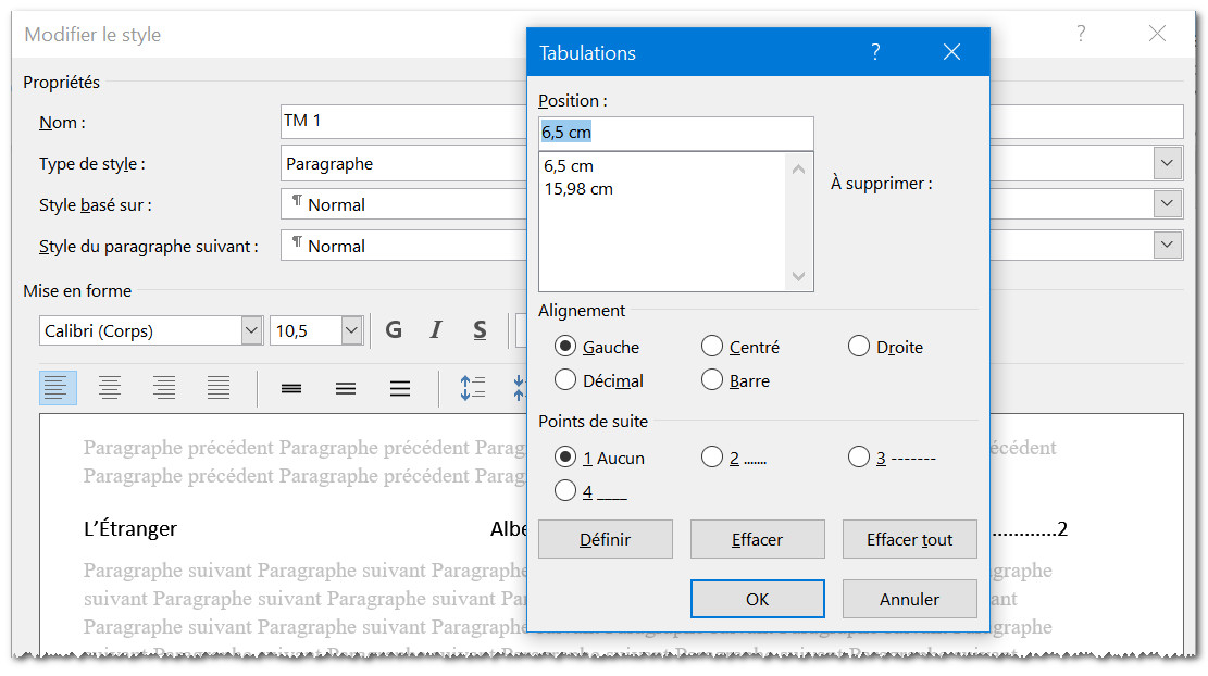 La table des matières sera, quant à elle, insérée automatiquement, comme une table ordinaire. Il conviendra juste de modifier le style TM1 afin que les taquets de tabulation soient correctement positionnés. Dans mon exemple, j'ai juste ajouté le taquet de tabulation simple à 6,5 cm. Je n'ai pas touché au taquet par défaut qui permet d'aligner les numéros de page à droite avec des points de suite.