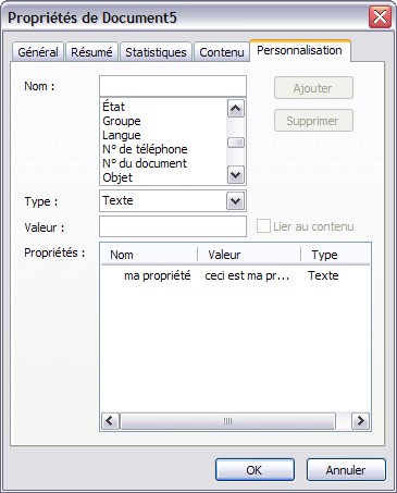 Il existe un certain nombre de propriétés existant par défaut, on peut en ajouter d'autres, ce seront les propriétés personnalisées. En tout état de cause, la propriété est à double sens. Cela signifie que vous pouvez la modifier directement dans le champ, et également dans la boîte de dialogue Propriétés.