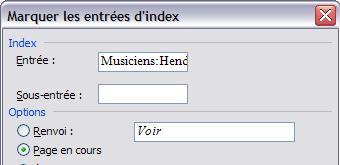Pour reprendre mon exemple avec "Jimi Hendrix", vous pouvez décider de tout répertorier sous Hendrix. Dans ce cas, dans la boîte de dialogue Marquer les entrées d'index, cochez l'option Renvoi, et tapez "Hendrix" dans la zone correspondante. Par défaut, le mot Voir est déjà saisi.