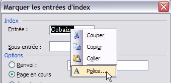 • Si vous souhaitez donner au texte de l'index une mise en forme particulière, cliquez dessus avec le bouton droit dans la zone Entrée (ou sous-entrée), et cliquez sur Police, puis sélectionnez la mise en forme de votre choix. Vous remarquerez que, dans ce cas, il n'y a pas de commutateurs particuliers, c'est tout simplement le texte de l'index qui prend le format souhaité ; cela revient à dire que vous pouvez très bien sélectionner le texte une fois l'entrée d'index marqué et modifier les attributs comme vous semble.