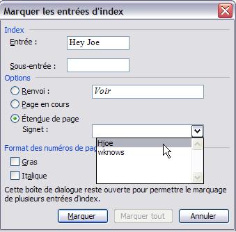 Voyons maintenant les différentes options de la boîte de dialogue Marquer les entrées d'index.