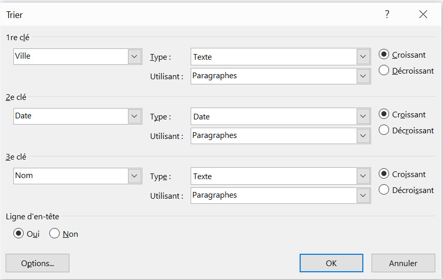 Le tri d'un tableau dans Word, avec l'utilisation de plusieurs critères se fait de la même manière que dans Excel.